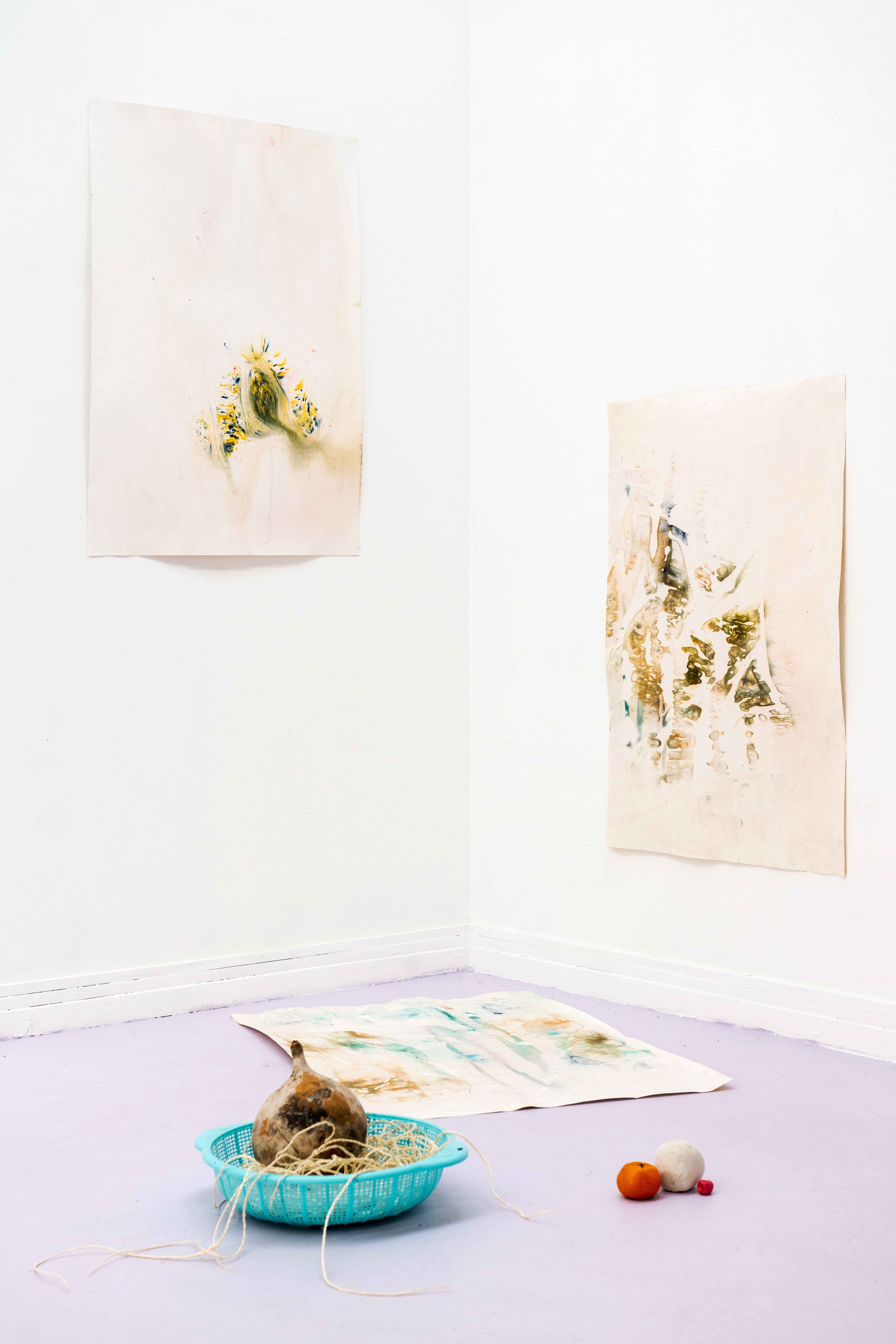 I guess it depends. I would say that earlier, before this residency, all my work would start based on material and then become a work. This current work with embroidery which will be included in the show in Havana later in the year is part of a larger piece but was cut out. I love to reuse things that already have a life or a purpose. I like to use things from my everyday life, like the blueberries in that work: It starts from a very basic point, where I was eating blueberries for two weeks straight, and I thought “Well I have so much, let me see what I can do with it.” Because I was already using a lot of flowers, not just to make the color but also the print on the painting, it’s a material I already had and was interacting with. I was also interested in the fact that I was using it in different stages, like smashing it into paper, into the textile, and seeing what it leaves behind. Also when I’m rubbing the skin I can’t really predict the shape it’s going to take or even the color that it’s going to give. So, it's also a happy surprise for me. It’s an exciting way of making a new mark.