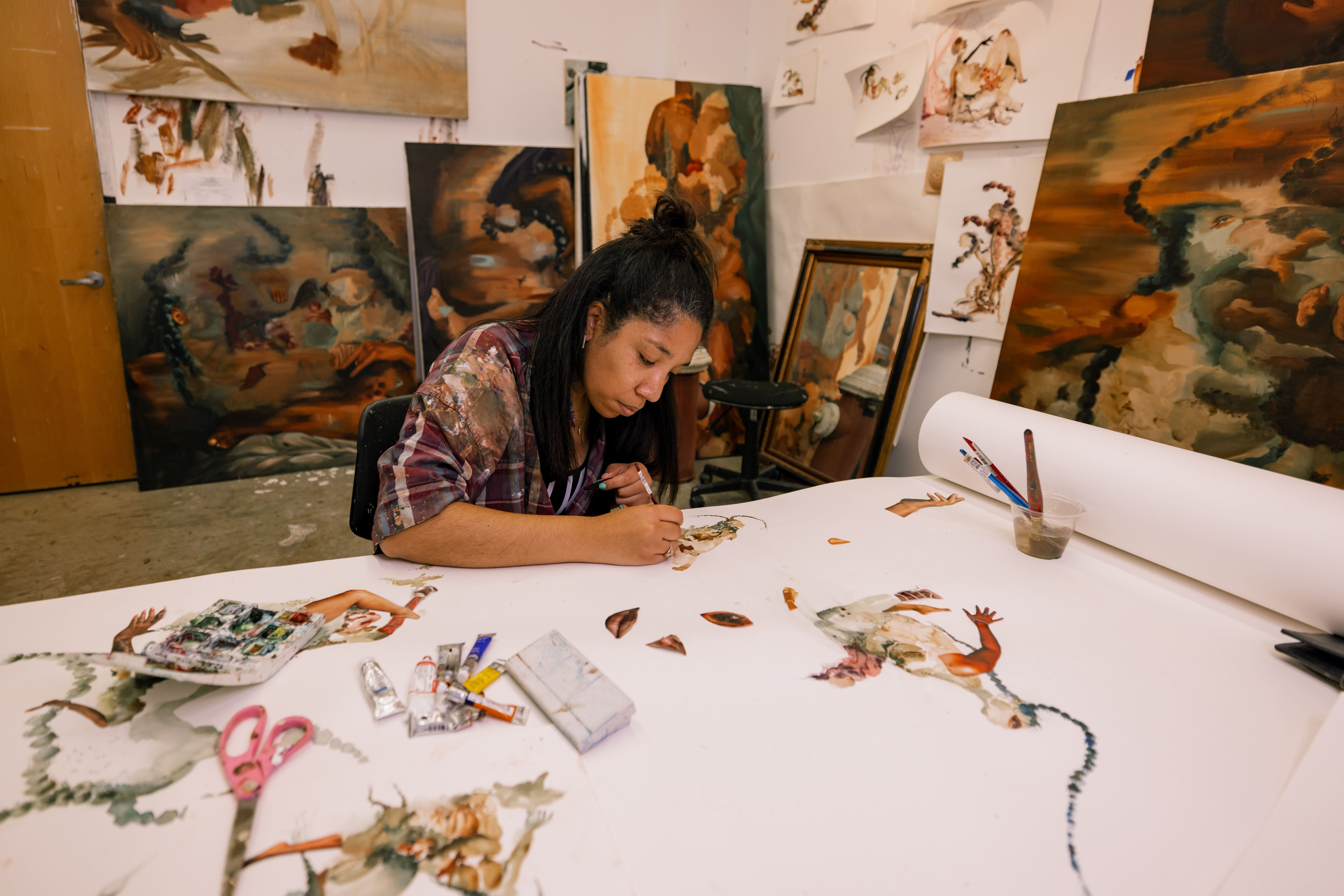 I approach my practice through watercolor sketches with collages from magazines such as Essence. Watercolor has always been the most approachable medium for me and I use it every time I want a natural flow of thought. The magazine cutouts nod to the notion that contemporary black women are still affected by the stories of the past.