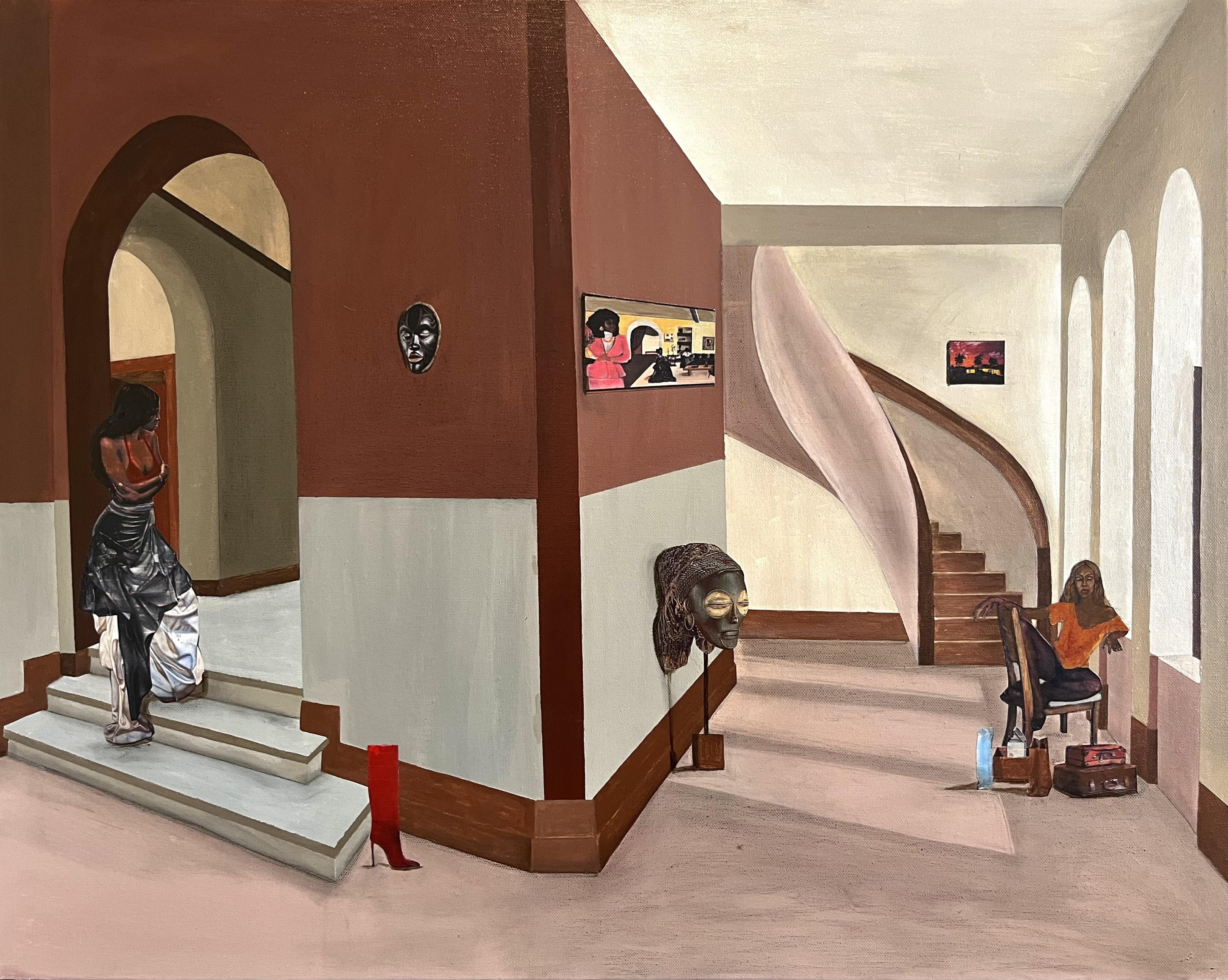 In addition, since my family and I moved to South Africa from the DRC, we have moved frequently and have been exposed to a variety of homes, structures, ways of living, languages, cultures, traditions and mannerisms. Painting a subject in a domestic space allows the viewer to gain more insight into their life and allows more room for sympathy and/or empathy from the audience. I have definitely thought of putting the women in different environments and have started to explore this; as you will see, I have recently started depicting spaces’ exterior views through the windows of the interior spaces, slowly but surely expanding my subjects’ worlds.